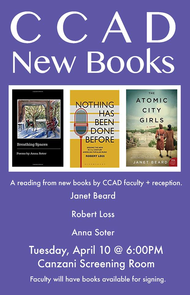 Pleased as punch to be reading at CCAD next week with my colleagues Janet Beard and Anna Soter, who also have new books out. Free to the public! Hope to see you there. Here's a link to the Facebook event page.